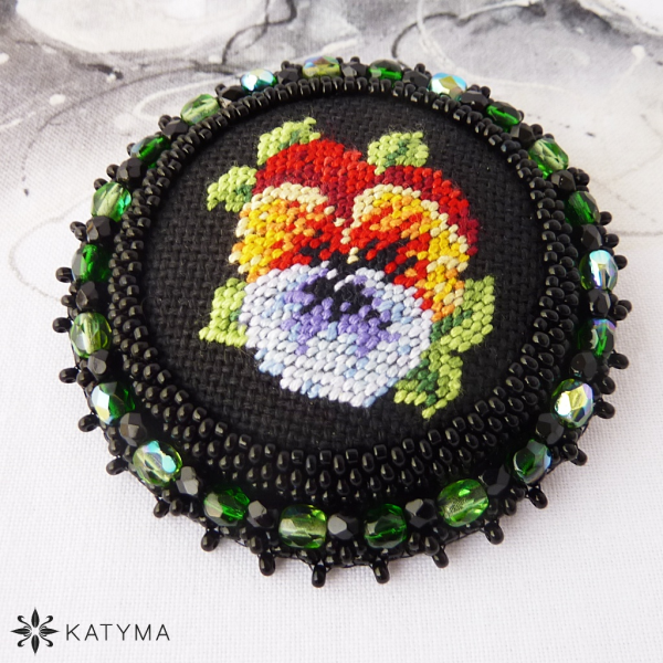 Zobrazit v plné velikosti Šitá brož s buttonkem s ruční květinovou výšivkou.