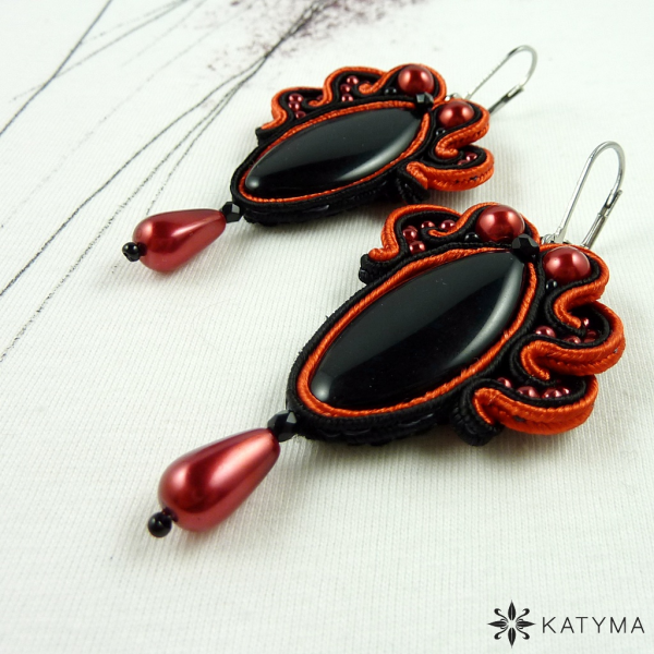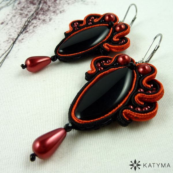 Základem náušnic jsou oválné mačkané černé korálky zdobené sutaškami v černé a červené barvě a doplněné červenými voskovými perličkami a černými lesklými ohňovkami.