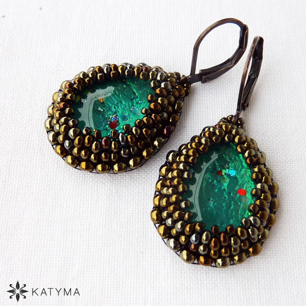 Zobrazit v plné velikosti Náušnice s ručně malovaným kabošonem obšité toho rokajlem a rokajlem Preciosa.