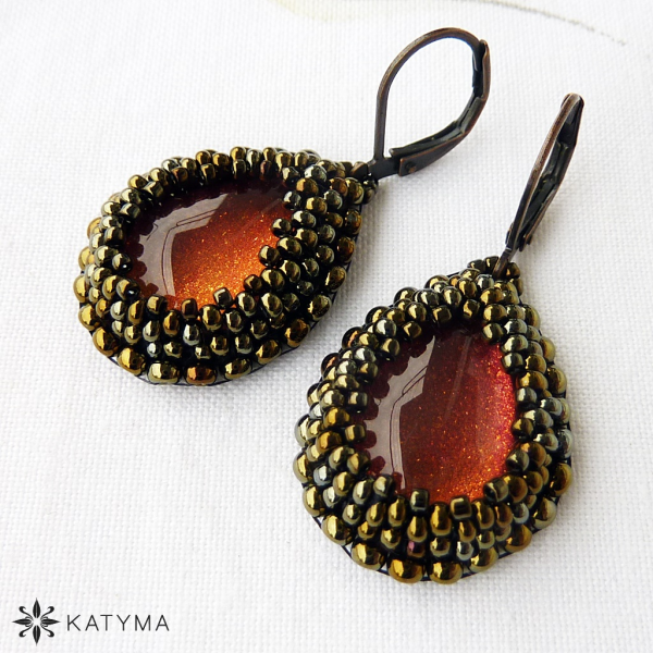 Náušnice s ručně malovaným kabošonem obšité toho rokajlem a rokajlem Preciosa.