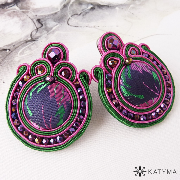 Originální šité náušnice šité z buttonku z českého brokátu, sutašek a českých broušených korálků a rokajlu.