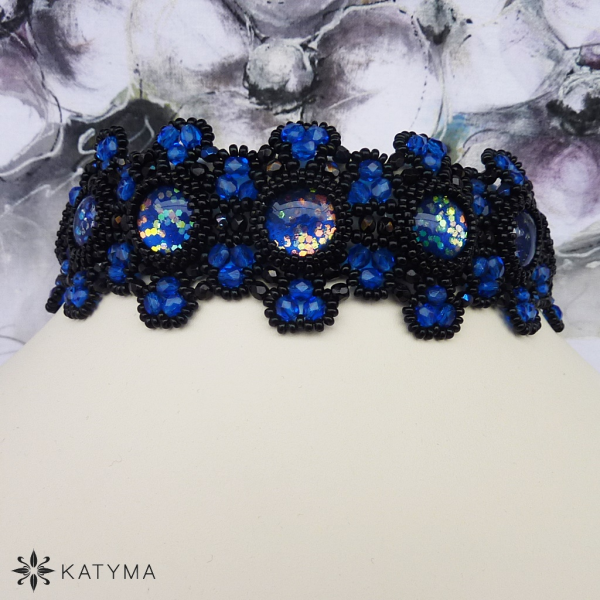 Obojek je vytvořen z broušených korálků a českého kulatého rokajlu Preciosa.