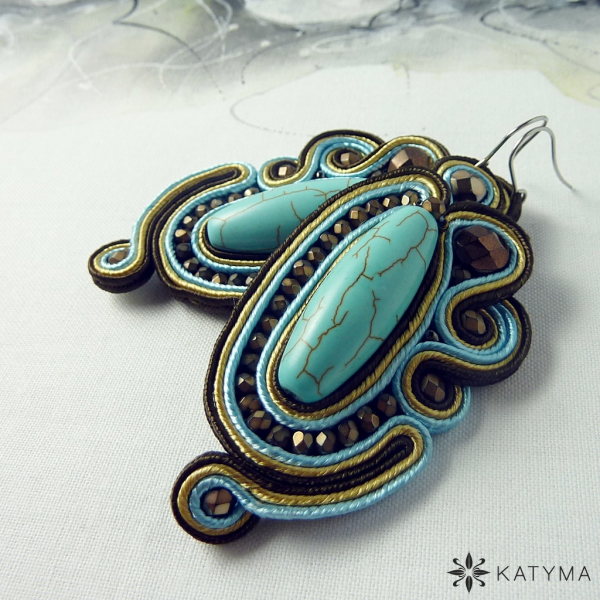 Základem náušnic jsou krásné tyrkysové kameny zdobené sutaškami v tyrkysové, zlatavé a tmavě hnědé barvě a doplněné ohňovkami v barvě hnědé pokov a kulatým českým rokajlem Preciosa ve velmi zajímavé barvě hnědý iris.