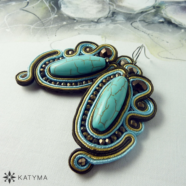 Krásné a zajímavé sutaškové náušnice ve světle tyrkysové, zlatavé a tmavě hnědé barvě.