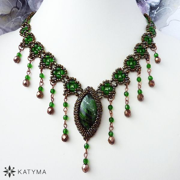 Ve špičce náhrdelníku je zapracovaná slza luxusního kabošonu chromdiopsidu.