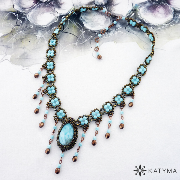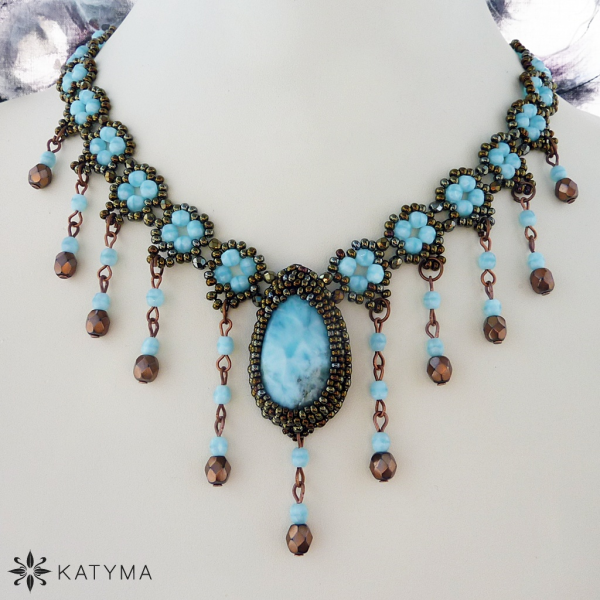 Ve špičce náhrdelníku je zapracovaná kapka luxusního kabošonu larimaru.
