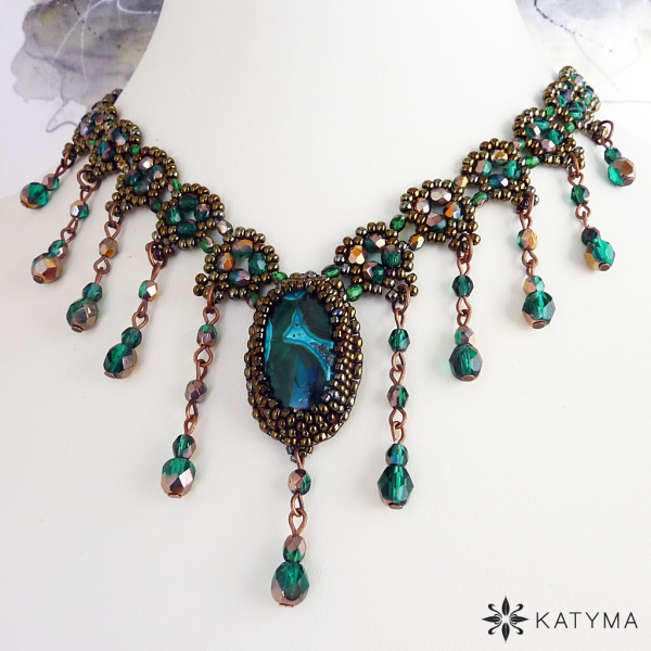 Náhrdelník má měděné zapínání na karabinku a adjustu zdobenou broušenými korálky.