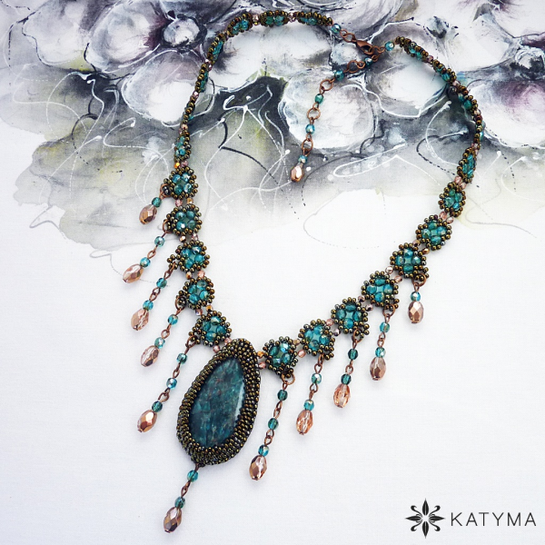 Náhrdelník má měděné zapínání na karabinku a adjustu zdobenou broušenými korálky.