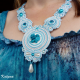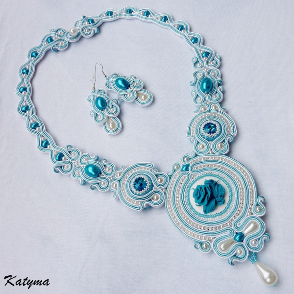 Dominantou náhrdelníku je krásná ručně vyrobená kamej z polymerové hmoty s tyrkysovou růží na bílém podkladě, kterou vytvořila paní Olena Nikolayeva. Dále jsou v náhrdelníku použity dvě rivoli Swarovski v tyrkysové barvě.
