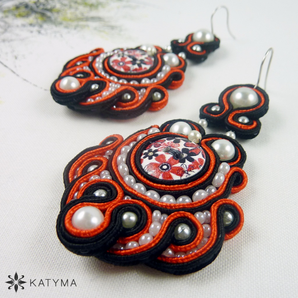 Náušnice jsou vytvořeny ze sutašek jasně červené a černé barvy. Použity jsou bílé voskové perličky různých velikostí a kulatý český rokajl Preciosa v bílé lesklé barvě.