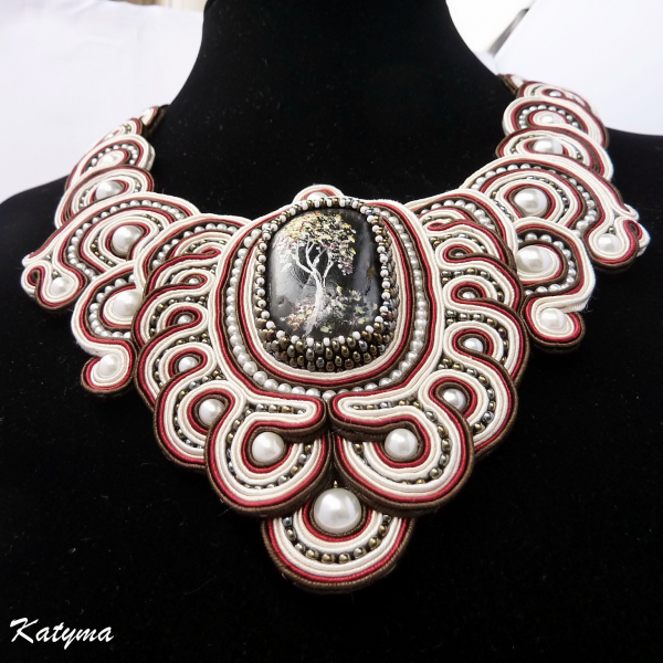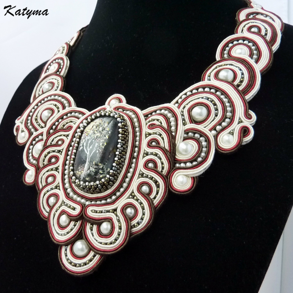 Náhrdelník je vytvořen z ručně malovaného kamínku, který vytvořila paní Andělka Janková, z bílých voskových perliček různých velikostí, velmi zajímavého rokajlu Preciosa v barvě hnědý iris a sutašek tmavě hnědé, smetanové, pískové barvy a barvy bordó.
