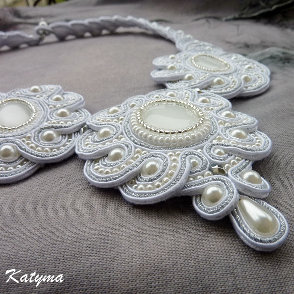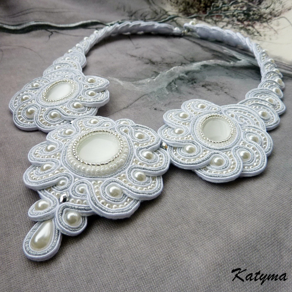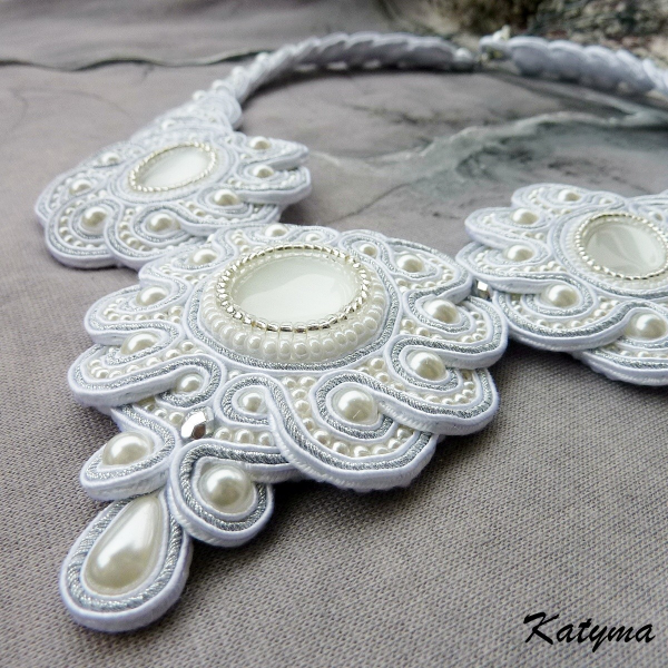 Náhrdelník je vytvořený z bílých kočičích očí, z bílých voskových perliček různých velikostí, stříbrných pokovených ohňovek a oliv, bílého a stříbrného rokajlu Preciosa a sutašek bílé a stříbrné barvy.
