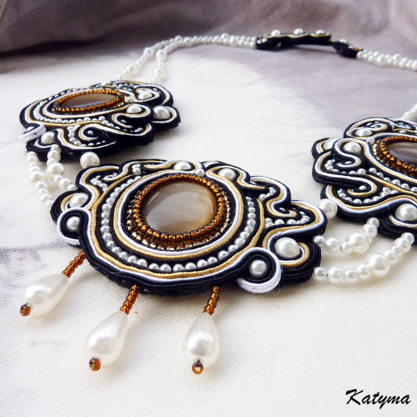 Náhrdelník je dále vytvořen z bílých voskových perliček různých velikostí, zlatého a medového rokajlu Preciosa a sutašek černé, bílé a medové barvy.