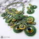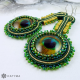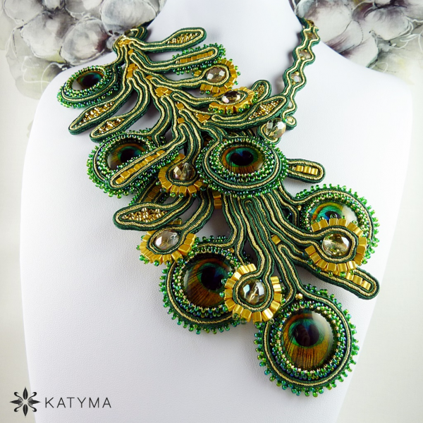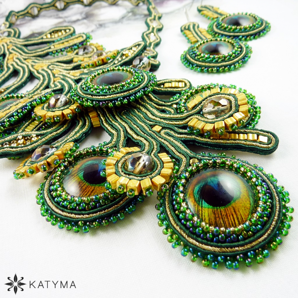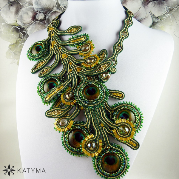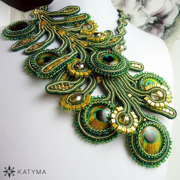 Dominantou náhrdelníku jsou krásná paví oka obšita českým kulatým rokajlem Preciosa v zelené barvě s AB efektem a zlatým toho-rokajlem.