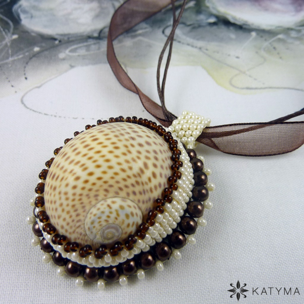 Přívěsek z přírodní mušle, která je obšita kulatým smetanovým a tmavě hnědým rokajlem Preciosa a zdobena tmavě hnědými voskovými perličkami.