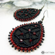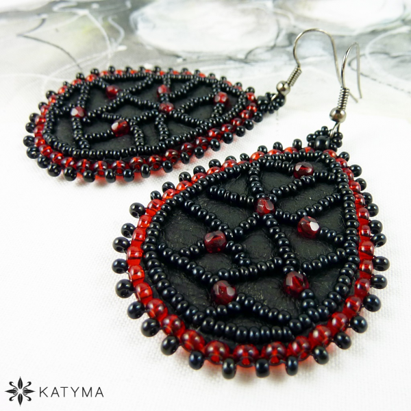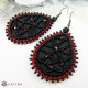 Velmi zajímavé černé náušnice ve tvaru slzy vyrobené z černé kůže, která je vyšívaná černým kulatým rokajlem Preciosa a červenými průhlednými broušenými korálky. Slzy jsou lemovány tmavě červeným kulatým rokajlem Preciosa v barvě broušených korálků.