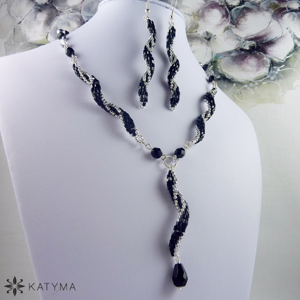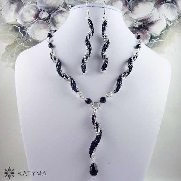 Souprava náhrdelníku a náušnic vytvořená z japonského toho-rokajlu hexagon černé barvy a toho rokajlu treasures stříbrné barvy.