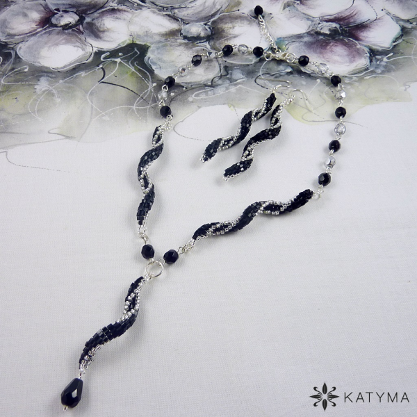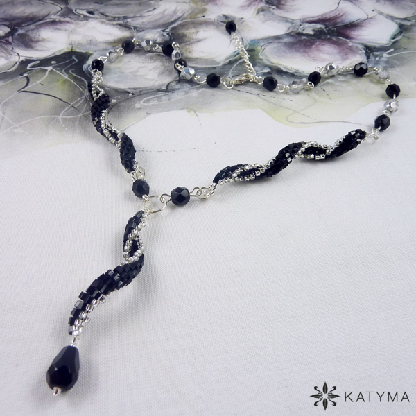 Náhrdelník je zakončen technikou ketlování broušenými černými a stříbrnými pokovenými korálky.
