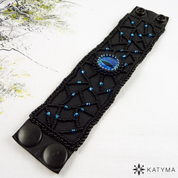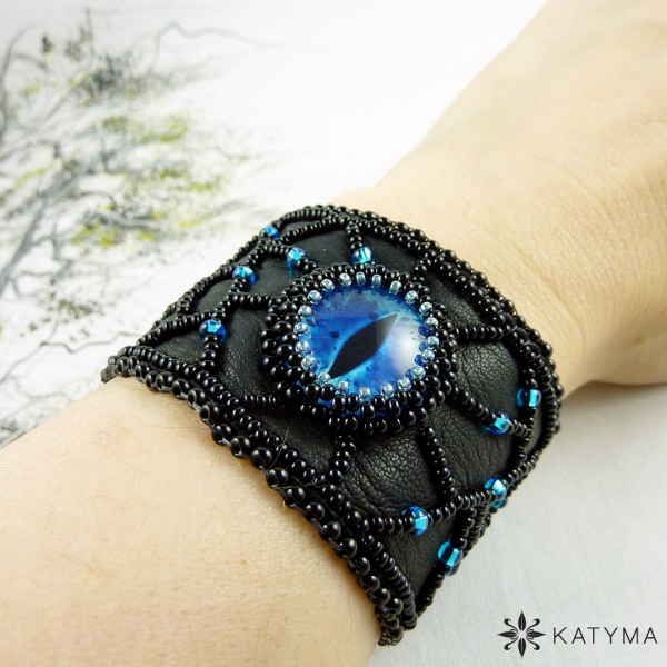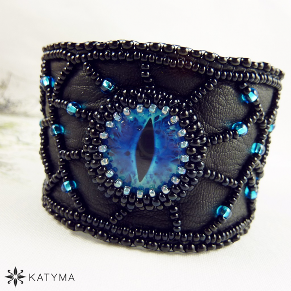 Originální autorský náramek z černé kůže zdobený modrotyrkysovým dračím okem obšitým černým kulatým rokajlem Preciosa a modrošedým toho-rokajlem.