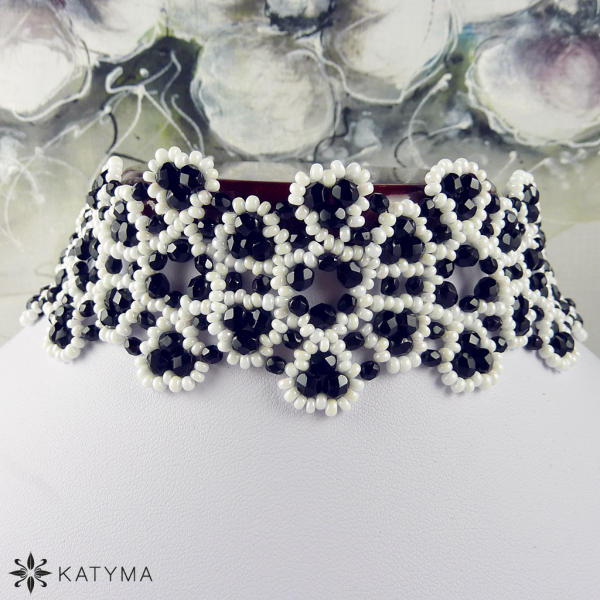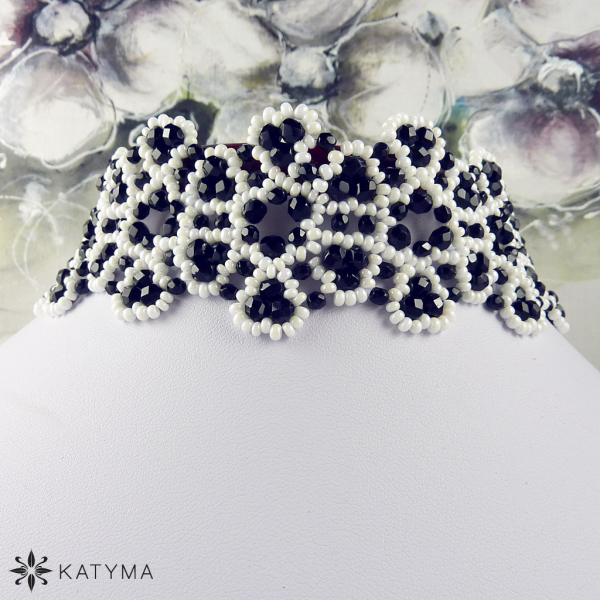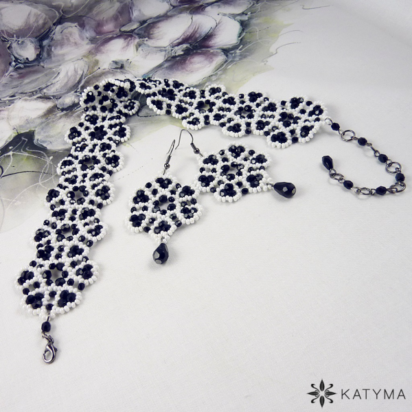 Souprava je vytvořena z černých lesklých broušených korálků a bílého perleťového kulatého rokajlu Preciosa.