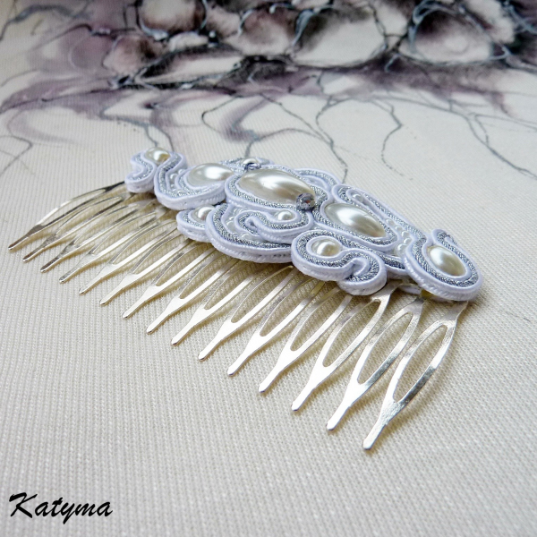 | velmi zajímavý svatební sutaškový hřebínek do vlasů. Hřebínek je vytvořený ze sutašek bílé a stříbrné barvy. Bílých oválných a kulatých voskových perliček různých velikostí, stříbrných ohňovek a rokajlu Preciosa. Rozměry hřebínku jsou cca 8 x 4 cm. Velikost ozdoby na hřebínku je cca 8 x 4 cm. Hřebínek je díky textilním komponentům velmi lehký a krásně drží ve vlasech. Jediný kus. |