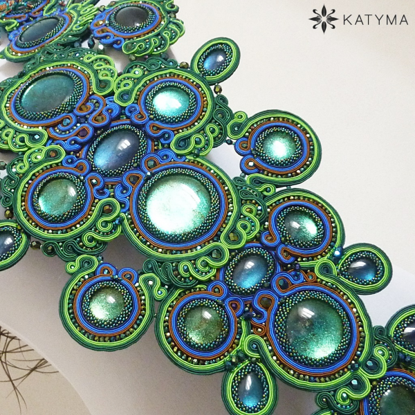 Sutašky použité na tento náhrdelník mají šest odstínů barev. Tři odstíny zelené, dva odstíny modré a měděnou.
