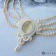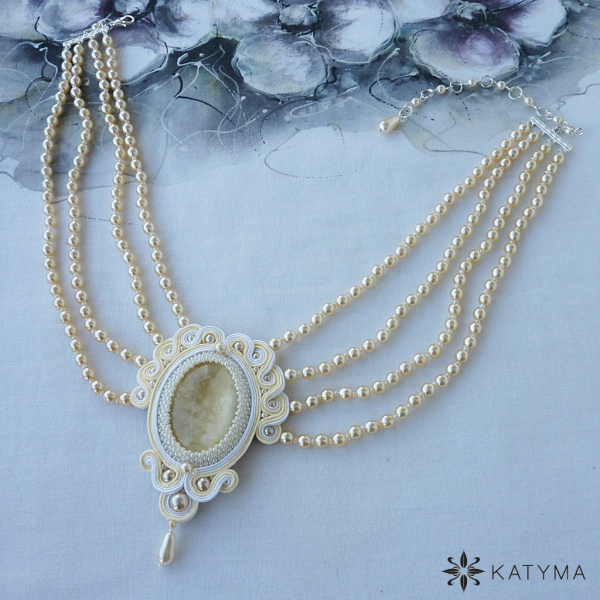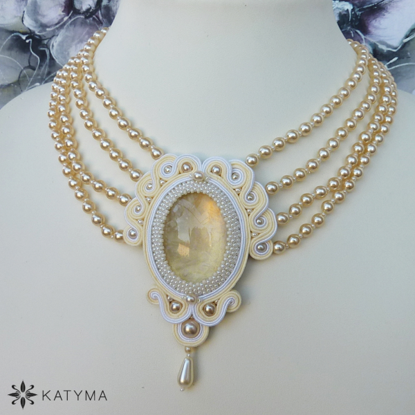 Náhrdelník je vyroben náročnou formou prýmkování z bílých a smetanových sutašek, rokajlu Preciosa, toho-rokajlu a smetanových voskových perliček.