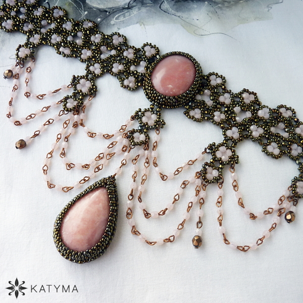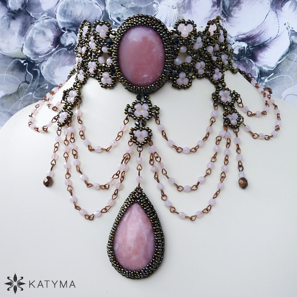 Zapínání náhrdelníku je na dvě měděné karabinky a dvě adjusty s broušenými korálky.