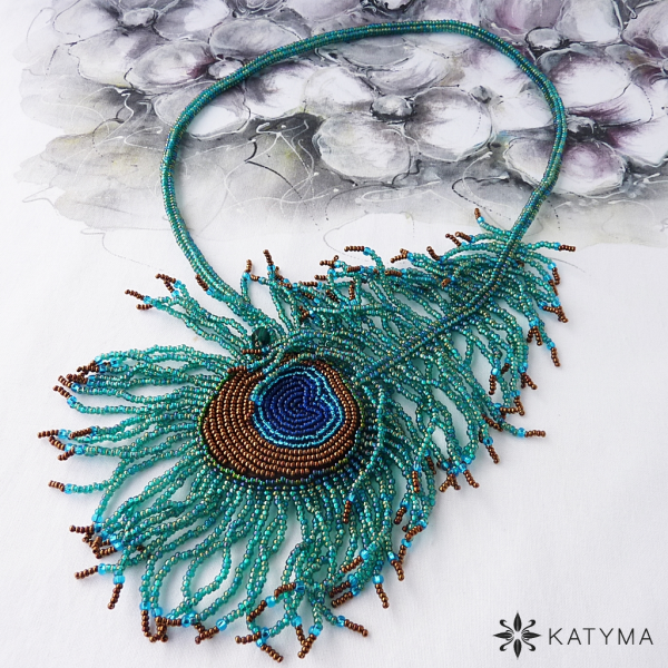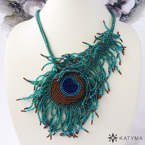 Tento šitý náhrdelník vyjadřuje kouzlo a nádheru pavích per.