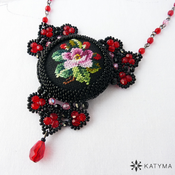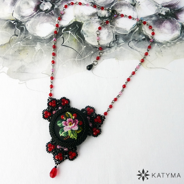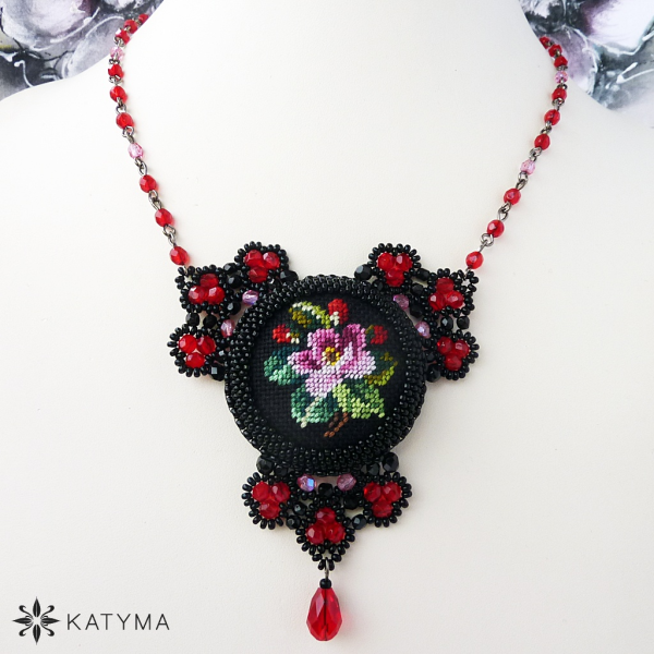 Náhrdelník je ozdoben jedním velkým buttonkem s ruční výšivkou šípkové růže.