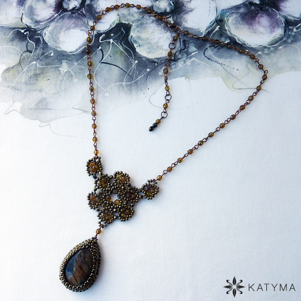 Náhrdelník má měděné zapínání na karabinku a adjustu zdobenou broušenými korálky.