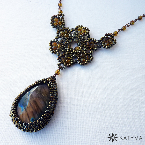 Použit je kabošon labradoritu ve tvaru kapky.