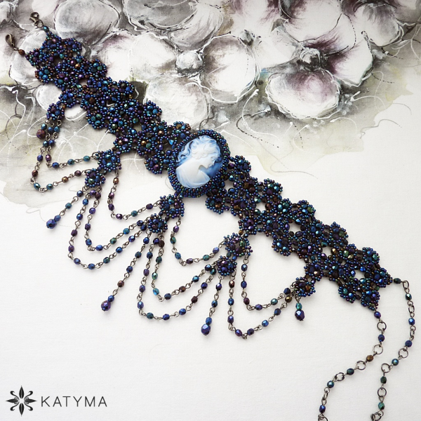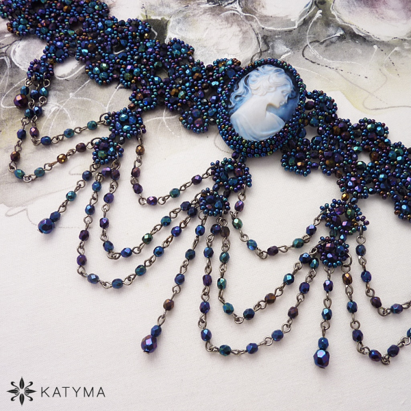 Obojek je vytvořen z broušených korálků a českého kulatého rokajlu Preciosa.
