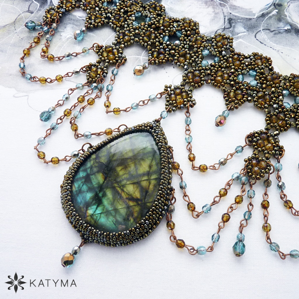 Zapínání náhrdelníku je na dvě měděné karabinky a dvě adjusty s broušenými korálky.