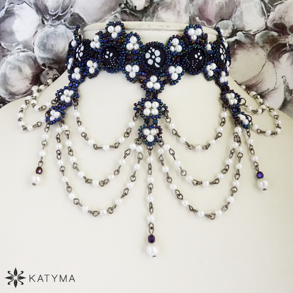 Obojek je vytvořen z broušených korálků, kvalitních neodíratelných perliček a českého kulatého rokajlu Preciosa.