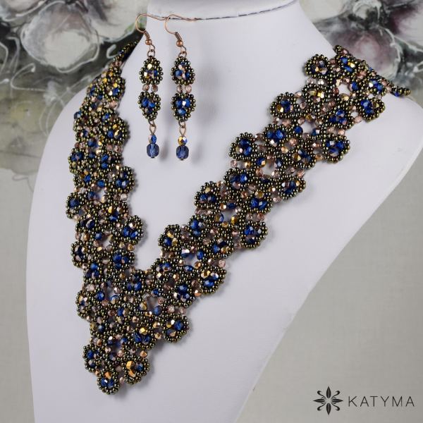 Náhrdelník je vytvořen z modrých pokovených měděných broušených krásných korálků, měděných broušených korálků a českého kulatého rokajlu Preciosa v barvě hnědý iris. Náhrdelník působí dojmem slavnostní krásné krajky.
