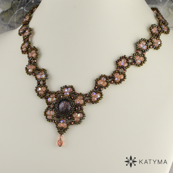 Zobrazit v plné velikosti Náhrdelník s malovaným kabošonem vytvořený z kulatého českého rokajlu Preciosa, toho-rokajlu a broušených ohňovek na přání.