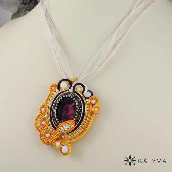 Přívěsek je zavěšen na organzové stužce bílé barvy, je možné nosit i na čemkoliv jiném.