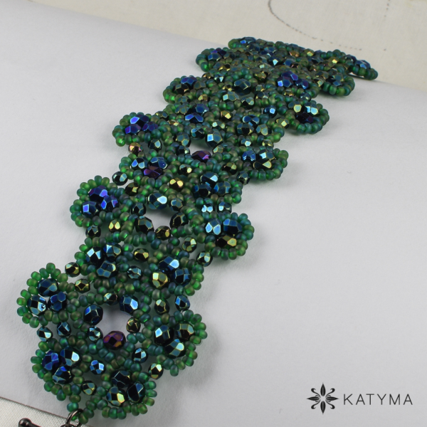 Zobrazit v plné velikosti Krajkový šitý náramek z ohňovek a českého kulatého rokajlu Preciosa.