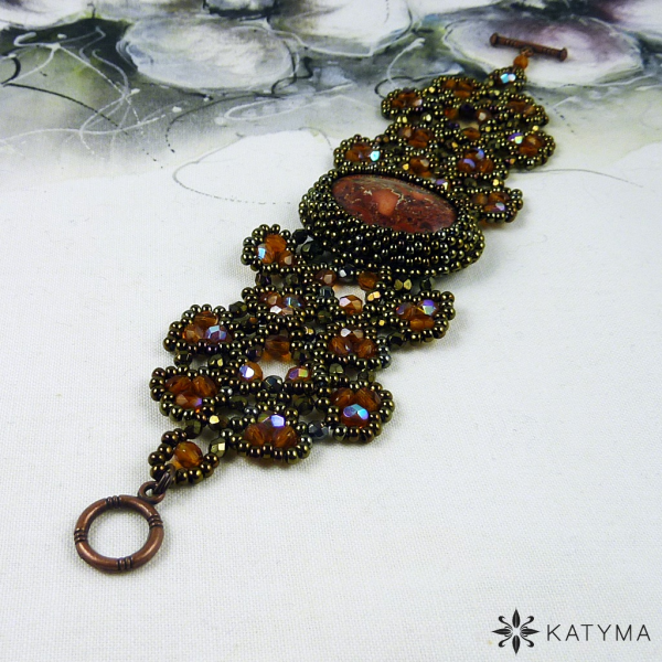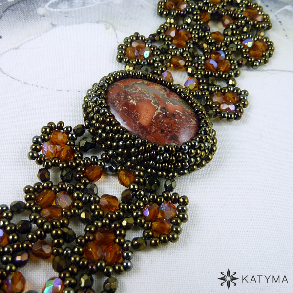 Uprostřed náramku je kabošon červeného brekciového jaspisu.