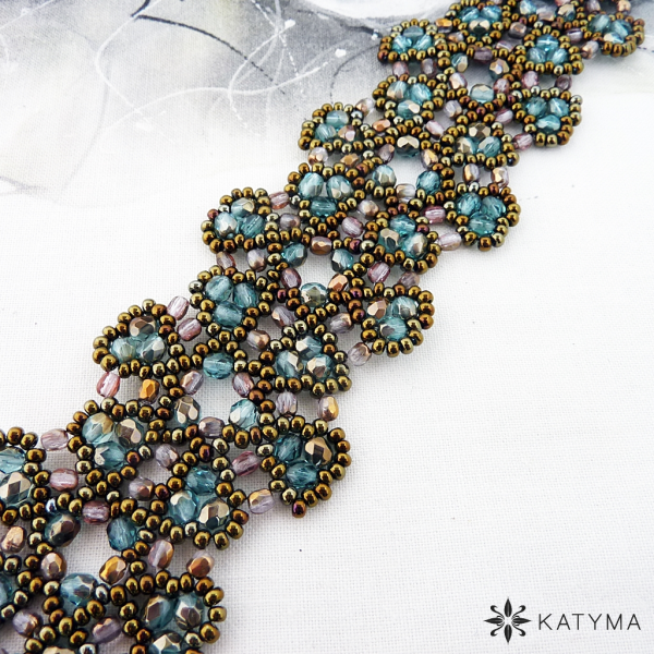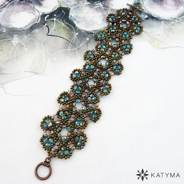 Krajkový šitý náramek z ohňovek a českého kulatého rokajlu Preciosa.