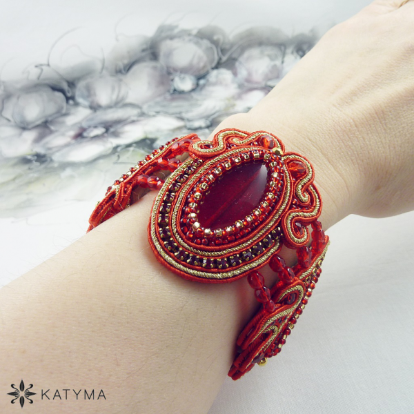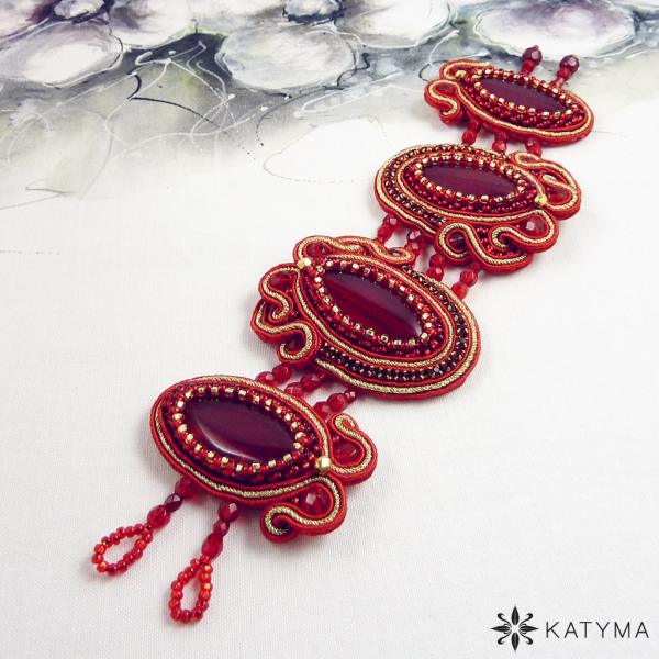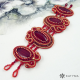 Náramek má zapínání šité z červeného rokajlu Preciosa a červených broušených korálků.