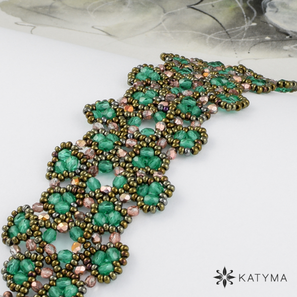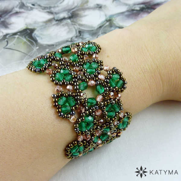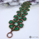 Velmi krásný krajkový šitý náramek ze smaragdově zelených broušených korálků, pokovených měděných ohňovek a velmi krásného rokajlu Preciosa v barvě hnědý iris.