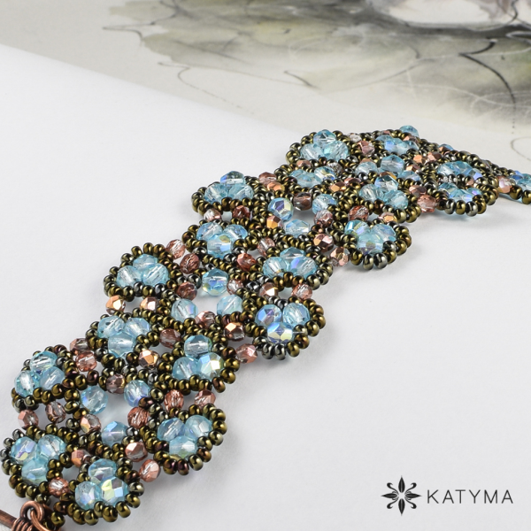Velmi krásný krajkový šitý náramek z pomněnkových broušených korálků, pokovených měděných ohňovek a velmi krásného rokajlu Preciosa v barvě hnědý iris.