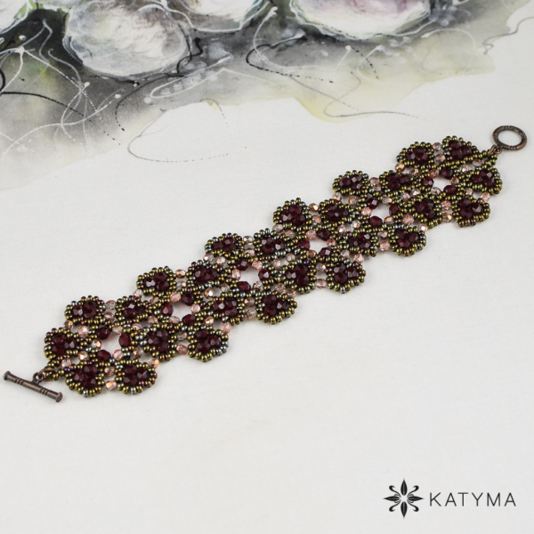 Velmi krásný krajkový šitý náramek z tmavě červených broušených korálků, pokovených měděných ohňovek a velmi krásného rokajlu Preciosa v barvě hnědý iris.