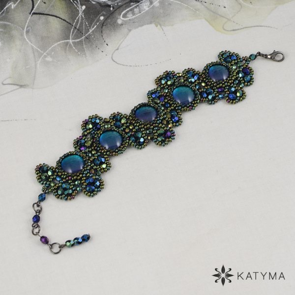 Náramek je vytvořen z 5 obšitých malovaných kabošonů. Kabošony jsou obšité kulatým rokajlem Preciosa a toho-rokajlem ve stejné barvě.