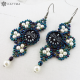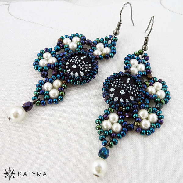 Náušnice šité z buttonků z českého modrotisku, voskových perliček, broušených korálků a rokajlu Preciosa.