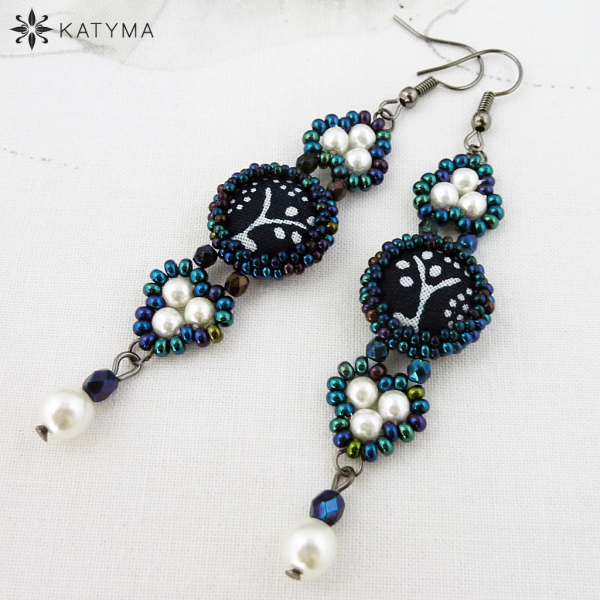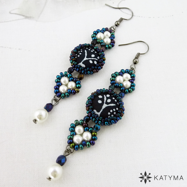 Náušnice šité z modrotiskových buttonků, voskových perliček, broušených korálků a rokajlu Preciosa.