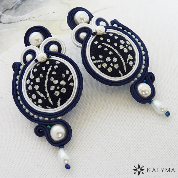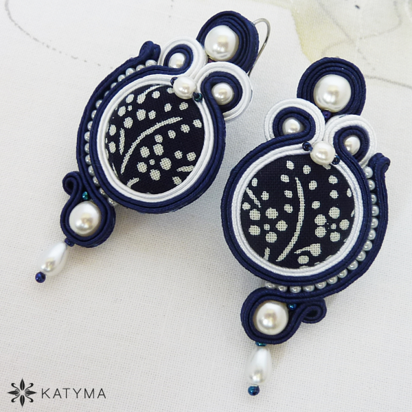 Náušnice vyrobené z buttonků z českého modrotisku a sutašek, voskových perliček a rokajlu Preciosa.