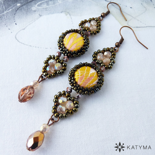 Náušnice šité z brokátových buttonků, broušených korálků a rokajlu Preciosa.